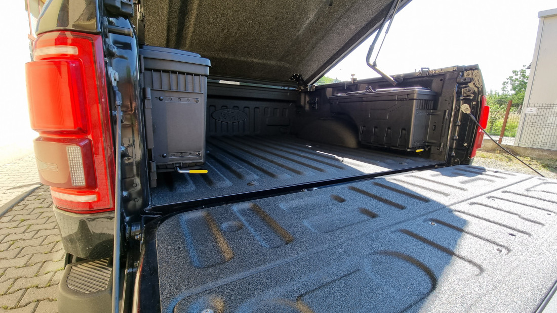On July 8, 2022, a Ford F-150 was equipped with a tonneau cover and swing cases. The solution was chosen for organized and secure cargo storage.