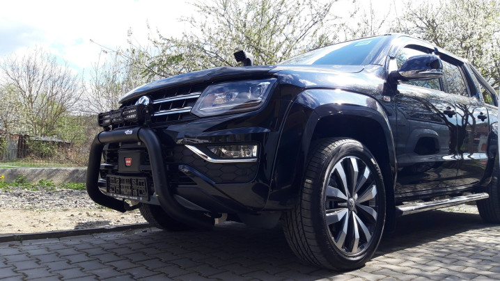 On June 5, 2019, a Volkswagen Amarok was equipped with a tonneau cover, bullbar, snorkel, and spot lights. The solution was chosen for off-road capability and protection.