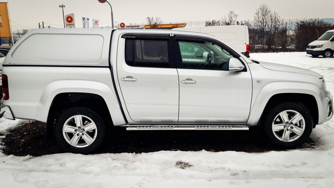 On January 15, 2020, a Volkswagen Amarok, model year 2018, was equipped with a canopy, side steps, window visors, bullbar, and spot lights. The solution was chosen for full protection and off-road readiness.